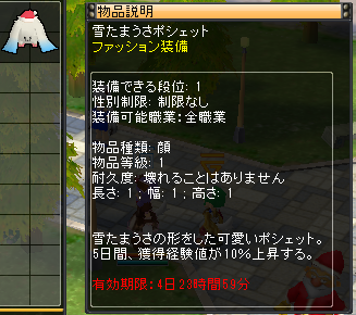 開封すると「雪たまうさポシェット」がもらえて、5日間経験値アップもついてました。